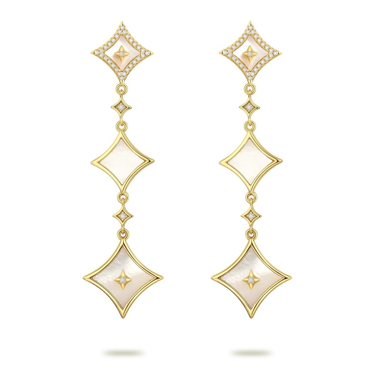 These earrings are handcrafted from sterling silver, 18k yellow gold plating, mother of pearl stone and microset with white cubic zirconia, anti-tarnishing and anti-allergic.