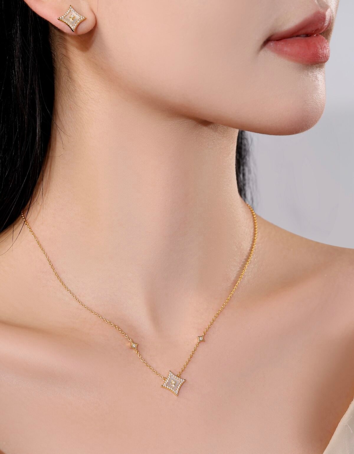 This Necklace is handcrafted from sterling silver, 18k yellow gold plating, mother of pearl stone and microset with white cubic zirconia.